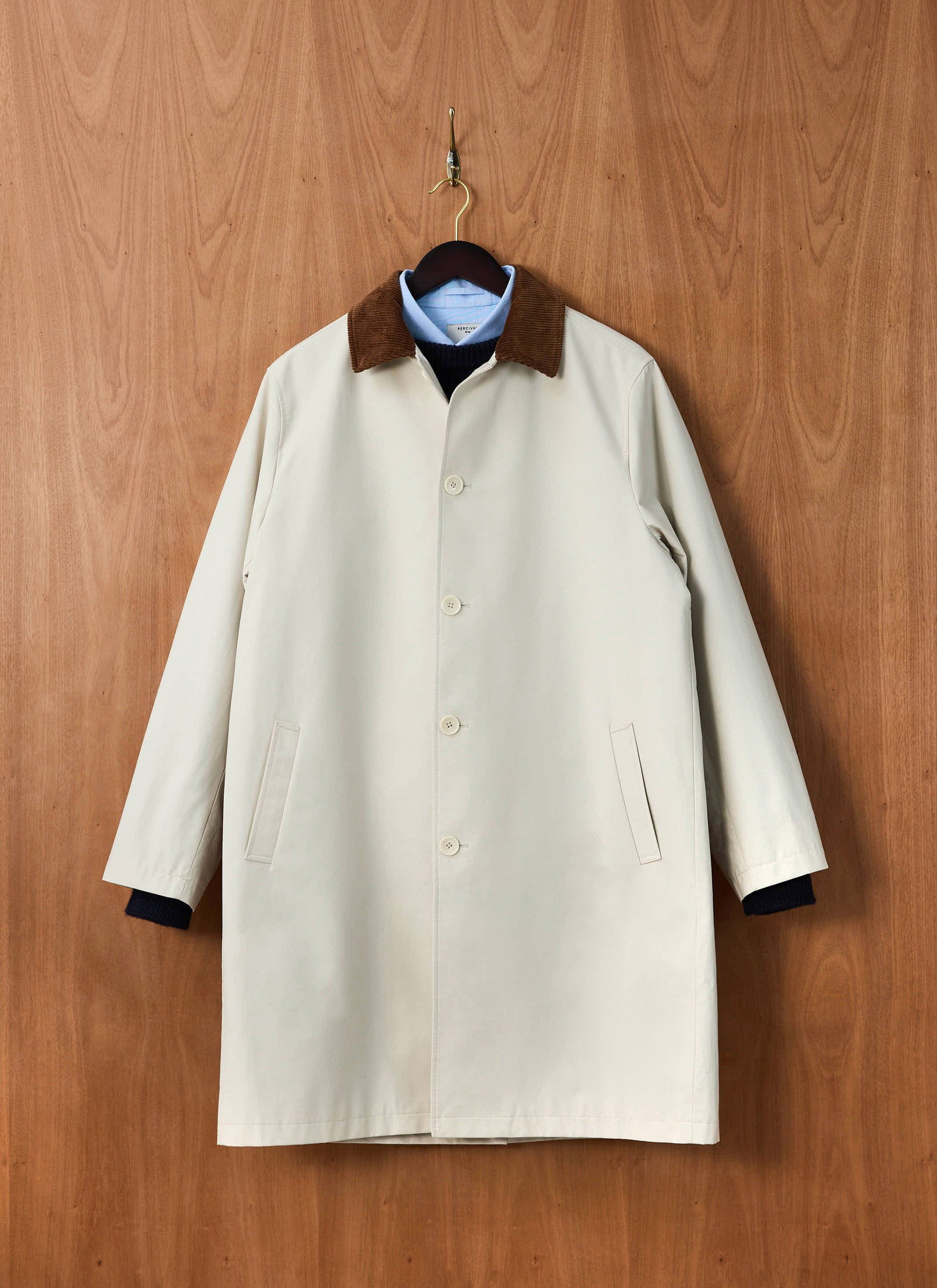 - Features: Men’s cream trench coat in a mid length cut made from cotton bonded fabric for water resistance. Designed with a contrast brown corduroy collar, button front fastening, two slanted welt pockets, a single back vent, and a partial lining in plaid check fabric with warm brown and navy tones. A structured yet relaxed stone trench coat that layers easily and works for both smart and casual wear.