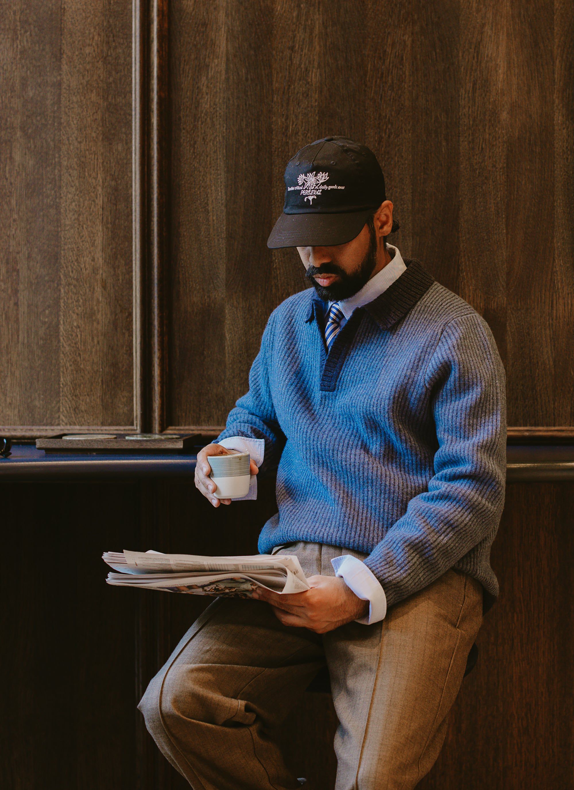 - Features: Men’s knitted pullover sweater in mid blue with navy contrast details. Made from 100% cotton in a mid to heavyweight knit with a regular fit. Designed with an open V placket, ribbed cuffs and hem, and vertical ribbed knit texture. A versatile knit, this polo shirt can be layered with a shirt and tie on display and easily layered.