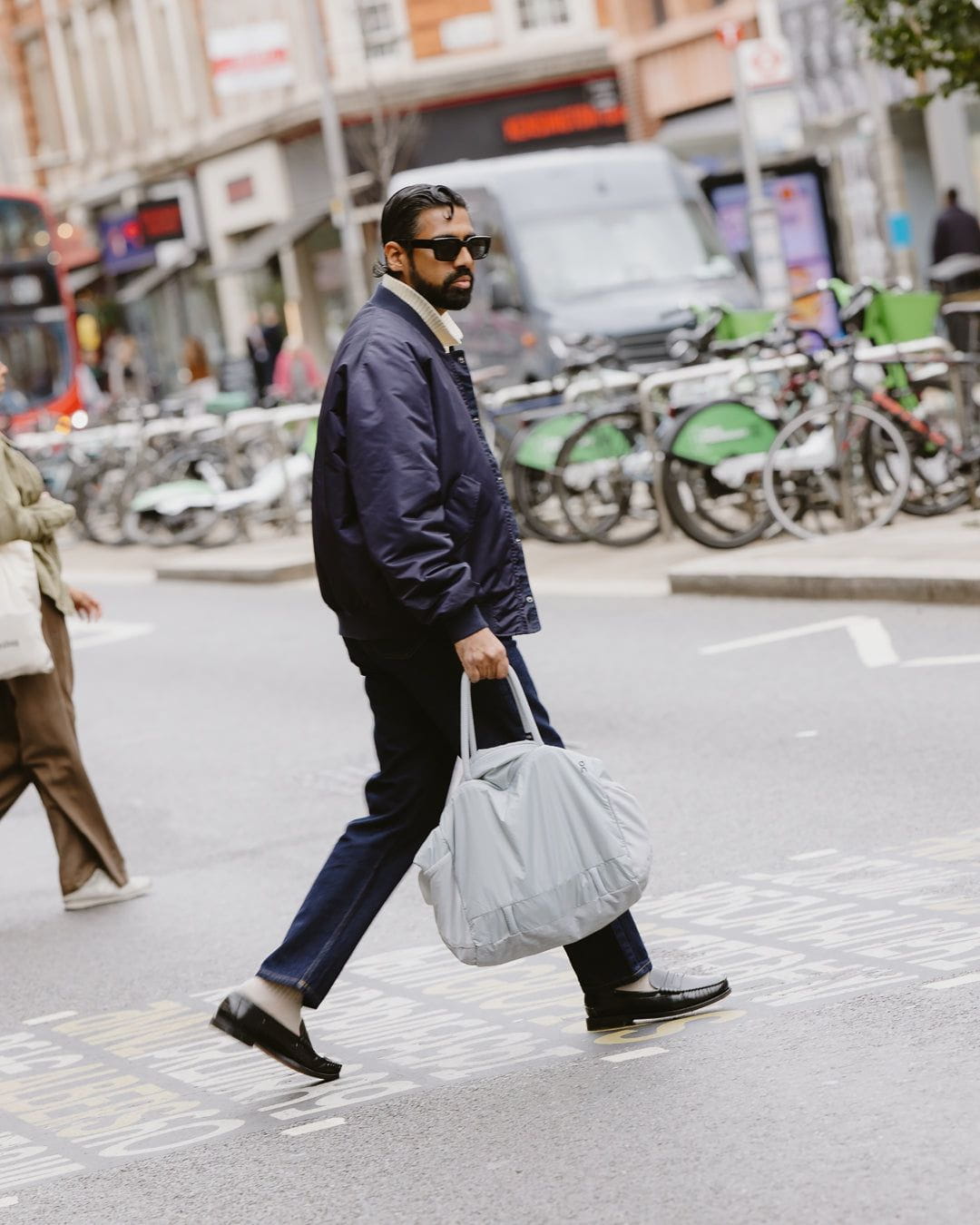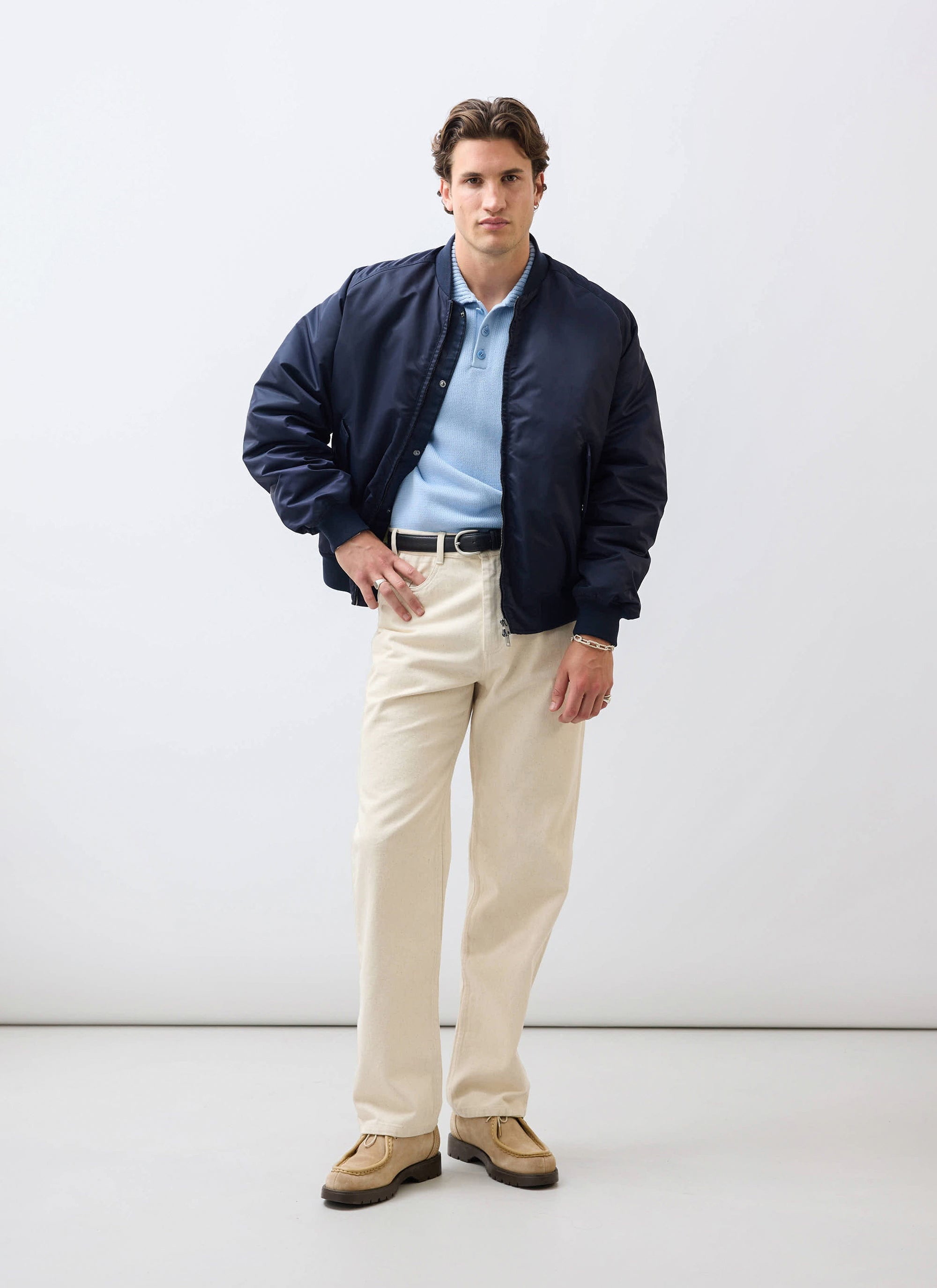 An easy way to get that easy-looking smart casual look is to pair a Nylon Bomber with Midwash Denim Jeans and a more relaxed shoe e.g. Off-white Vans.