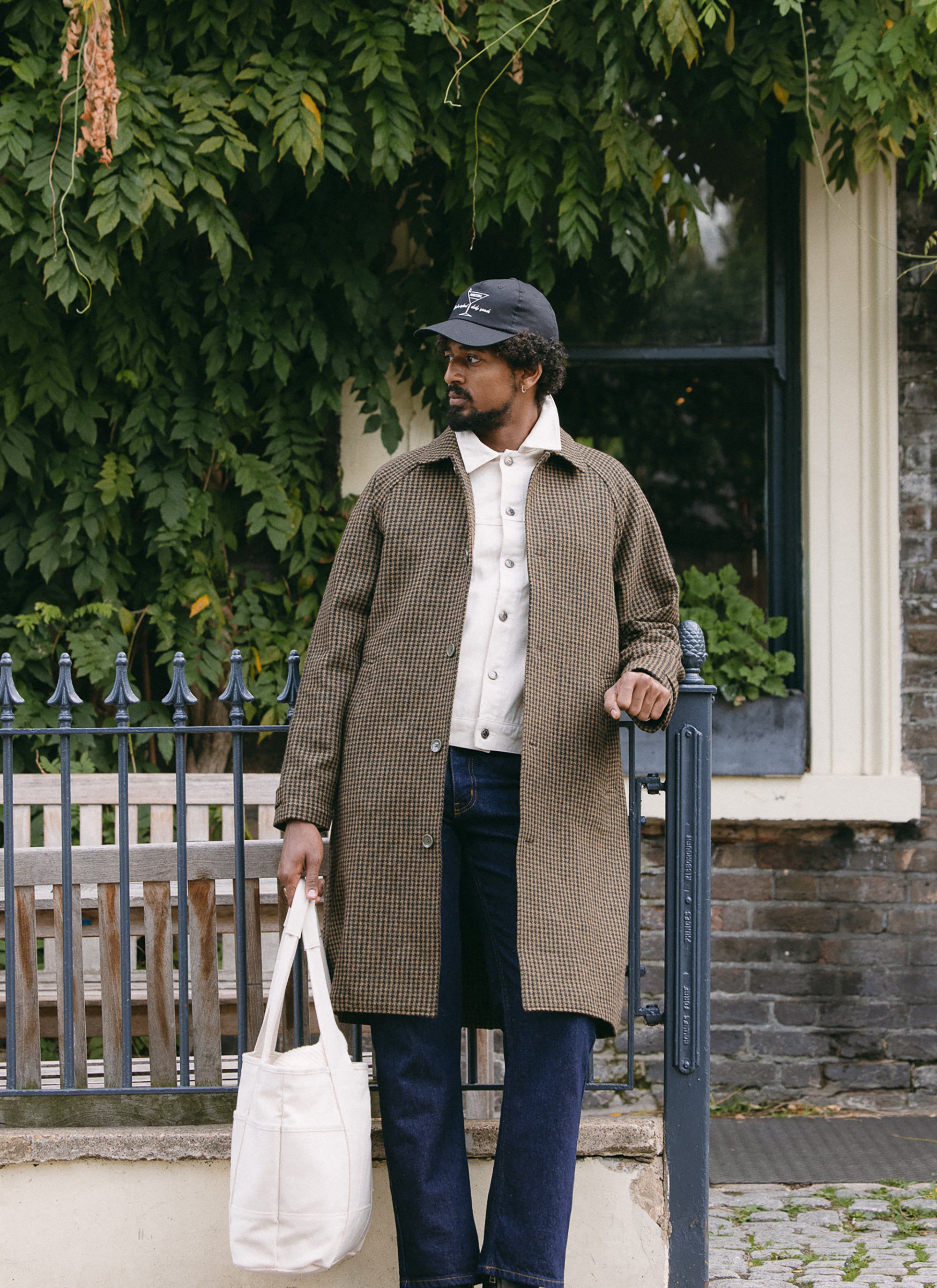 - Features: Men's overcoat made from a high wool content blend, this coat shows it's construction in detail with no lining but bound internal seams. Adjustable cuff, button down closure, external pockets, quality houndstooth check fabric.