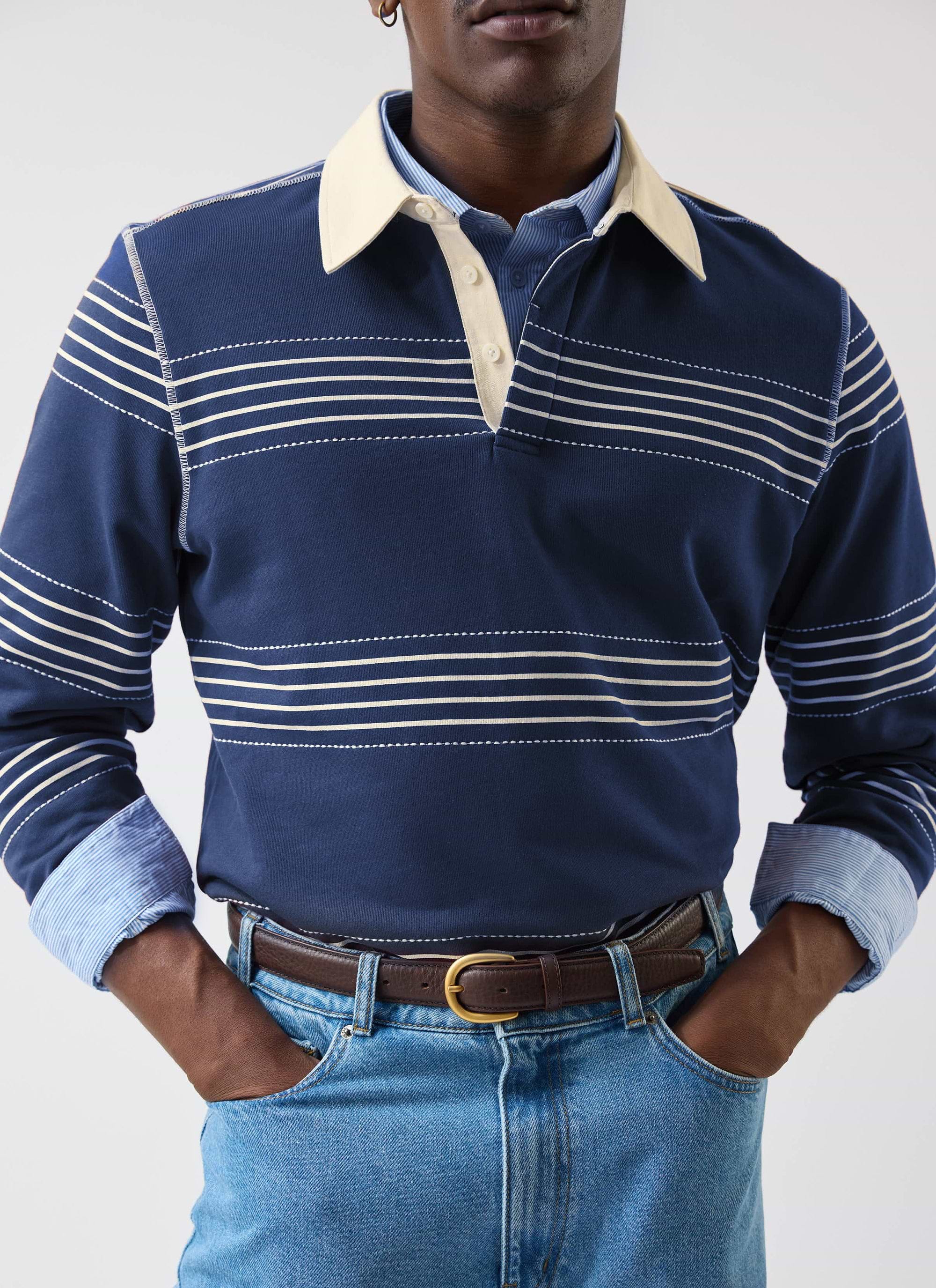 A letter to the Editor? Men's rugby polo, refined stitch and stripe details, taking inspiration from the spine of a book. Part of the Percival new season, inspired by the pages, where ever they take you.