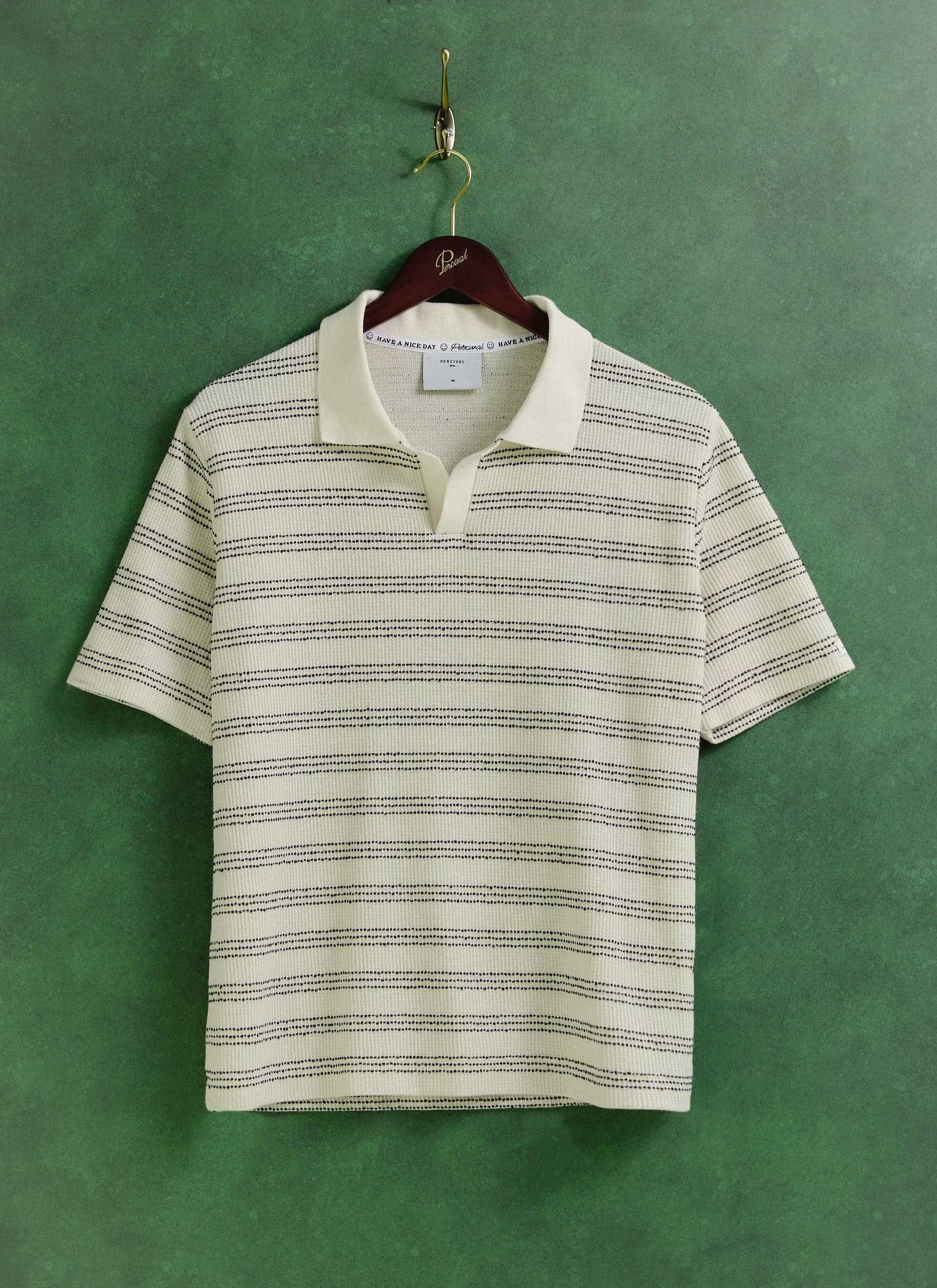 - Features: Short sleeve knitted polo with open collar, textured stripe stitch, ribbed cuffs and hem