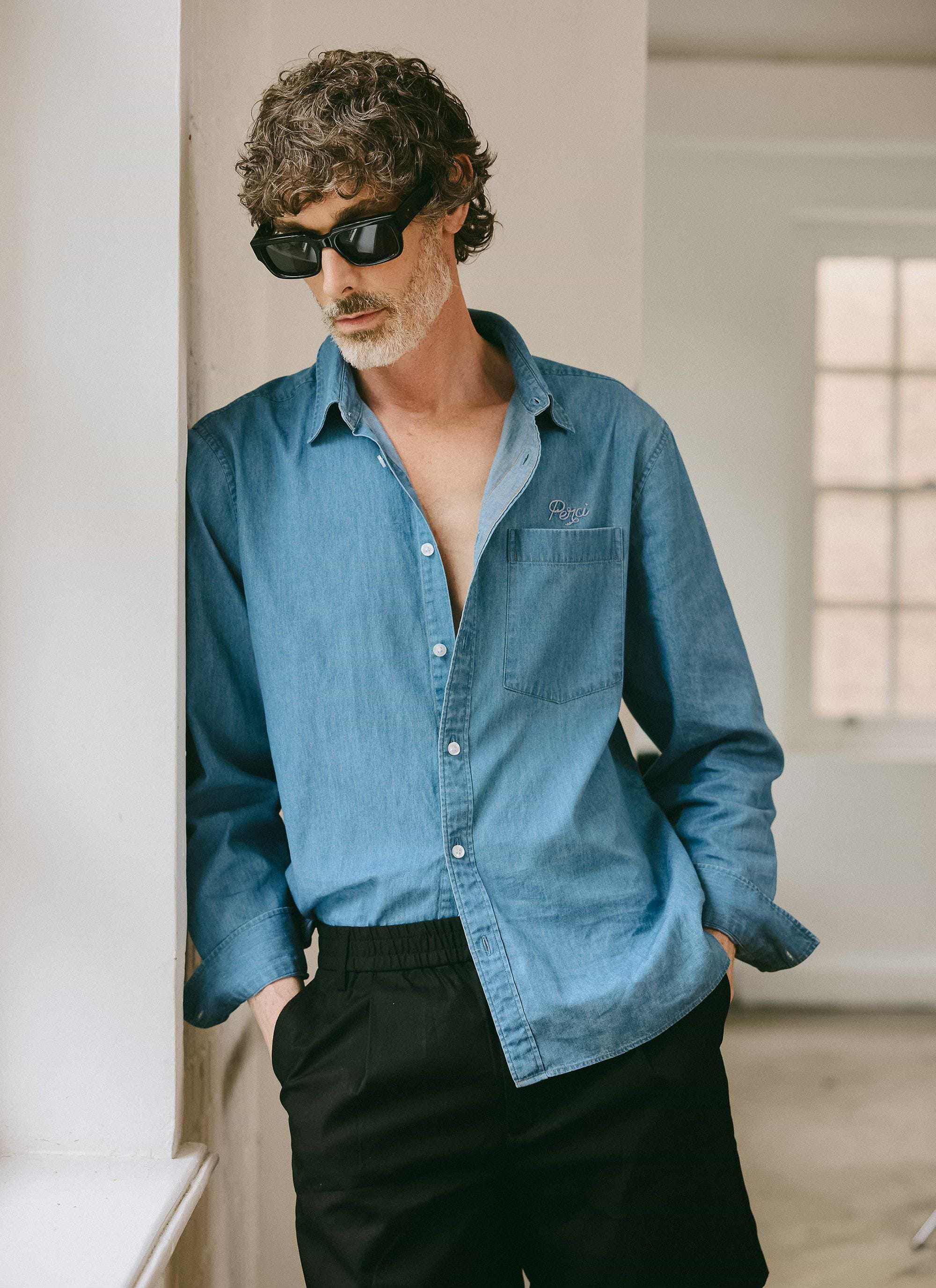 Marco Pearce Shirt. This is a Percival shirt cut in a slightly relaxed shape - because shirts need not be buttoned up, tailored, tied, and stuffy. Our first denim shirt, it’s lightweight with a gentle wash, perfect for layering over a Percival tee or waffle-knit vest, or under autumn knits.