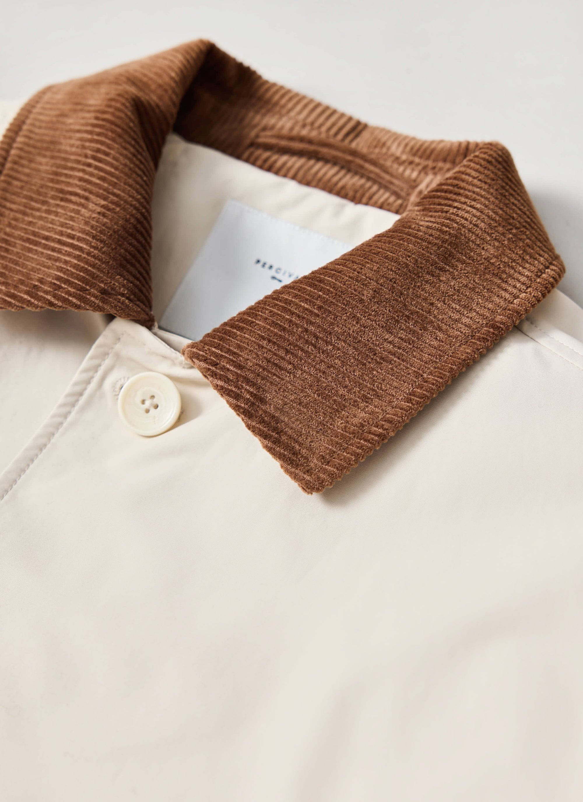 - Features: Men’s cream trench coat in a mid length cut made from cotton bonded fabric for water resistance. Designed with a contrast brown corduroy collar, button front fastening, two slanted welt pockets, a single back vent, and a partial lining in plaid check fabric with warm brown and navy tones. A structured yet relaxed stone trench coat that layers easily and works for both smart and casual wear.