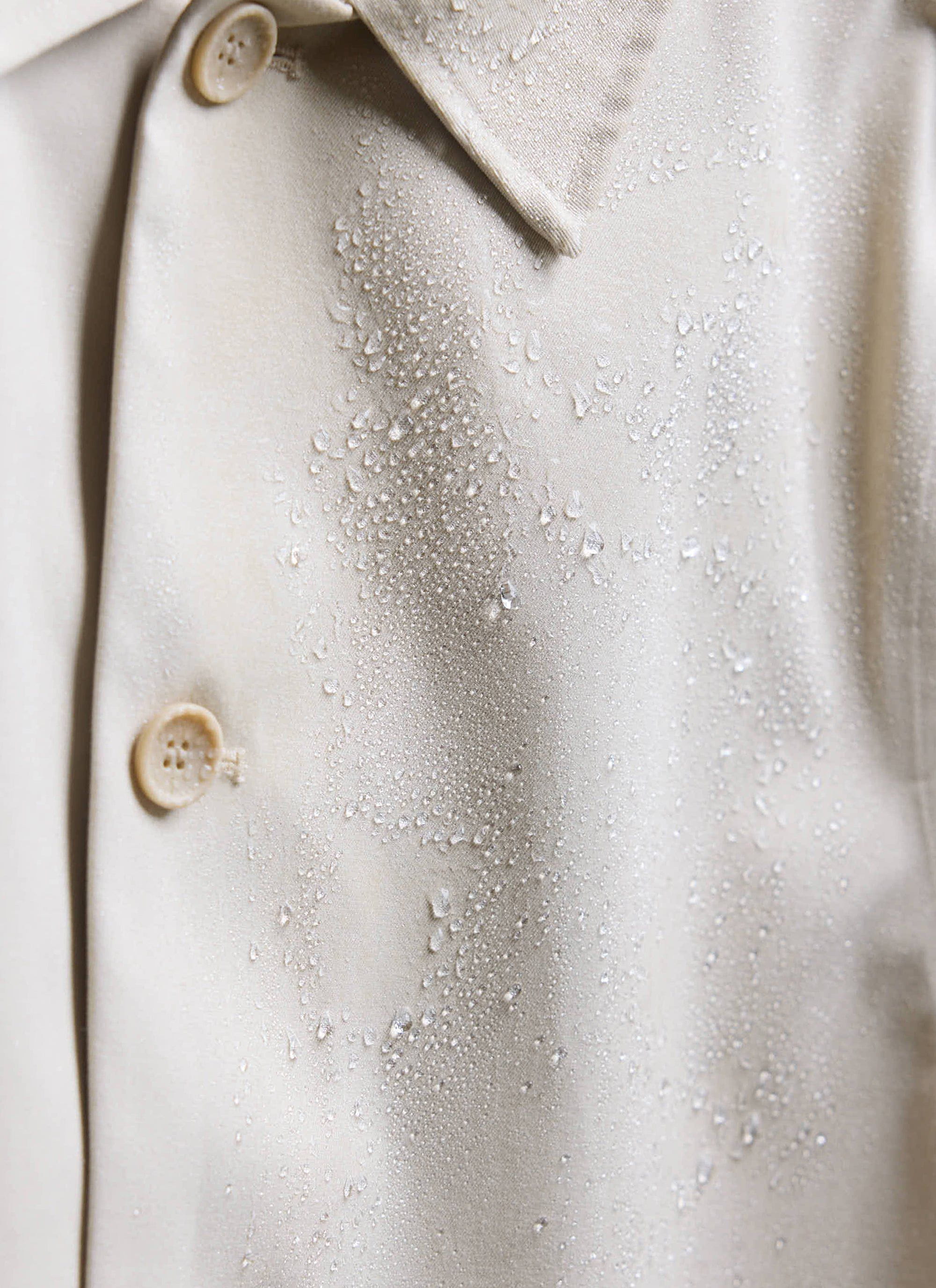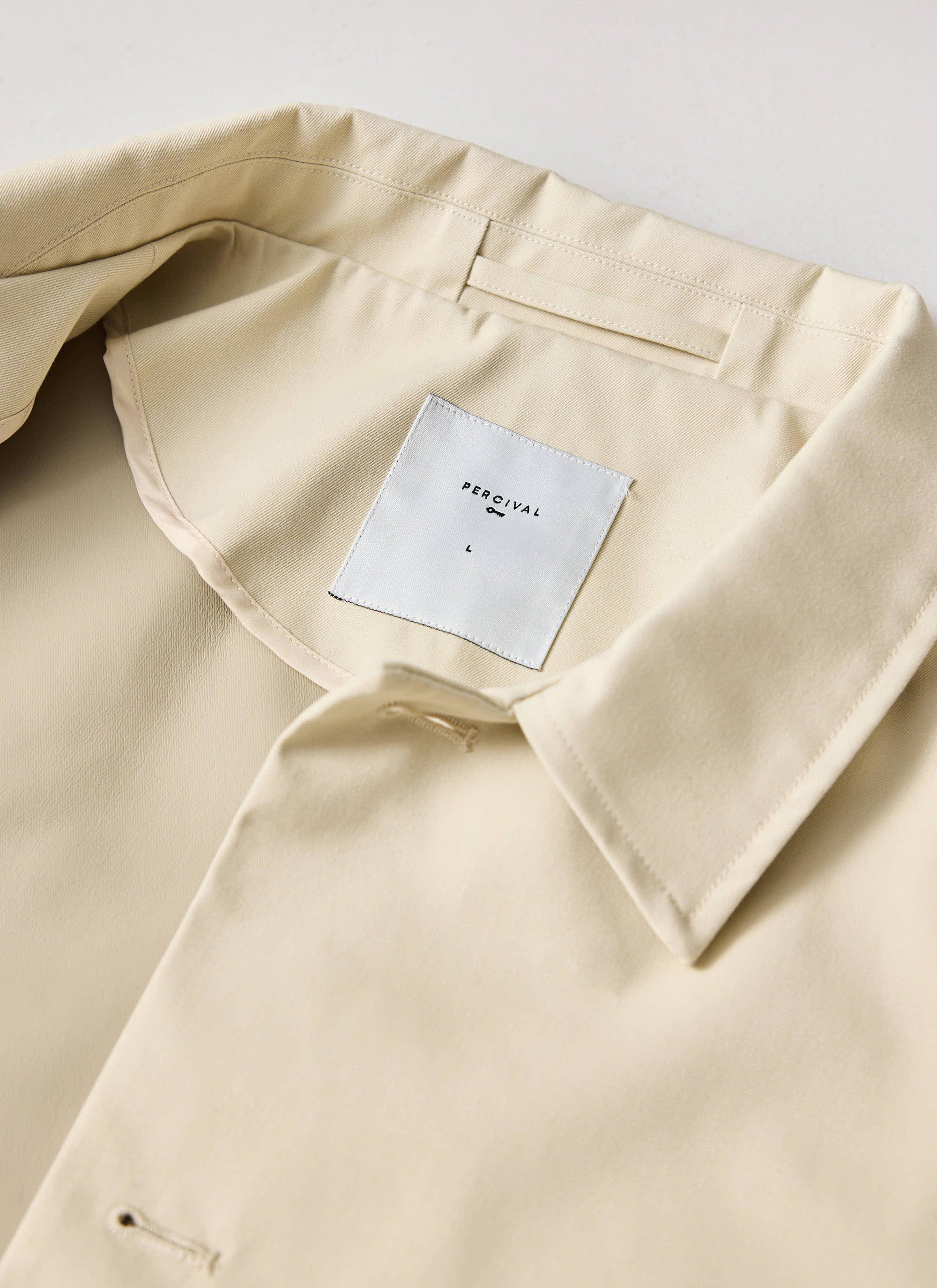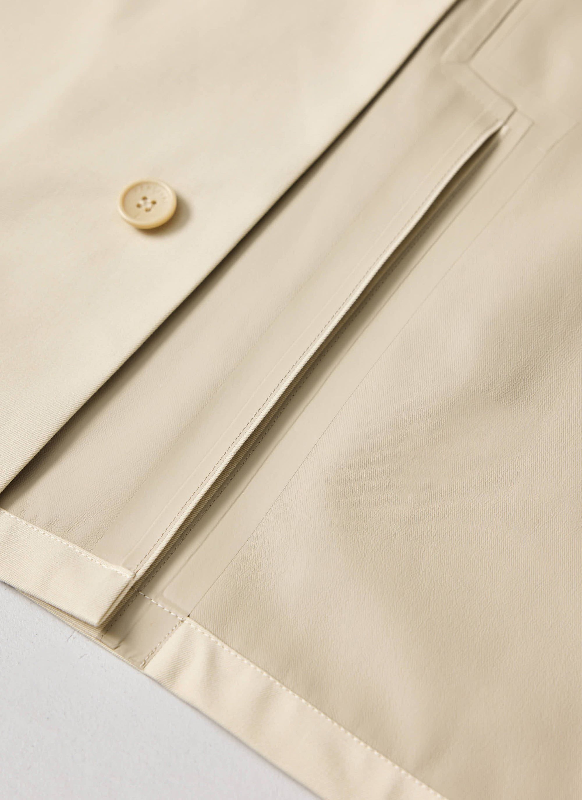 - Features: Men’s short trench coat in cream made from a 10,000mm waterproof technical fabric with 2000g/sqm breathability. Constructed with taped seams, contrast bonded PU lining, a large internal pocket that fits a MacBook, and two welt pockets. Designed with button fastening in a relaxed yet structured fit that is suitable for layering. A cream waterproof trench coat that combines classic styling with practical performance for daily wear and commuting.