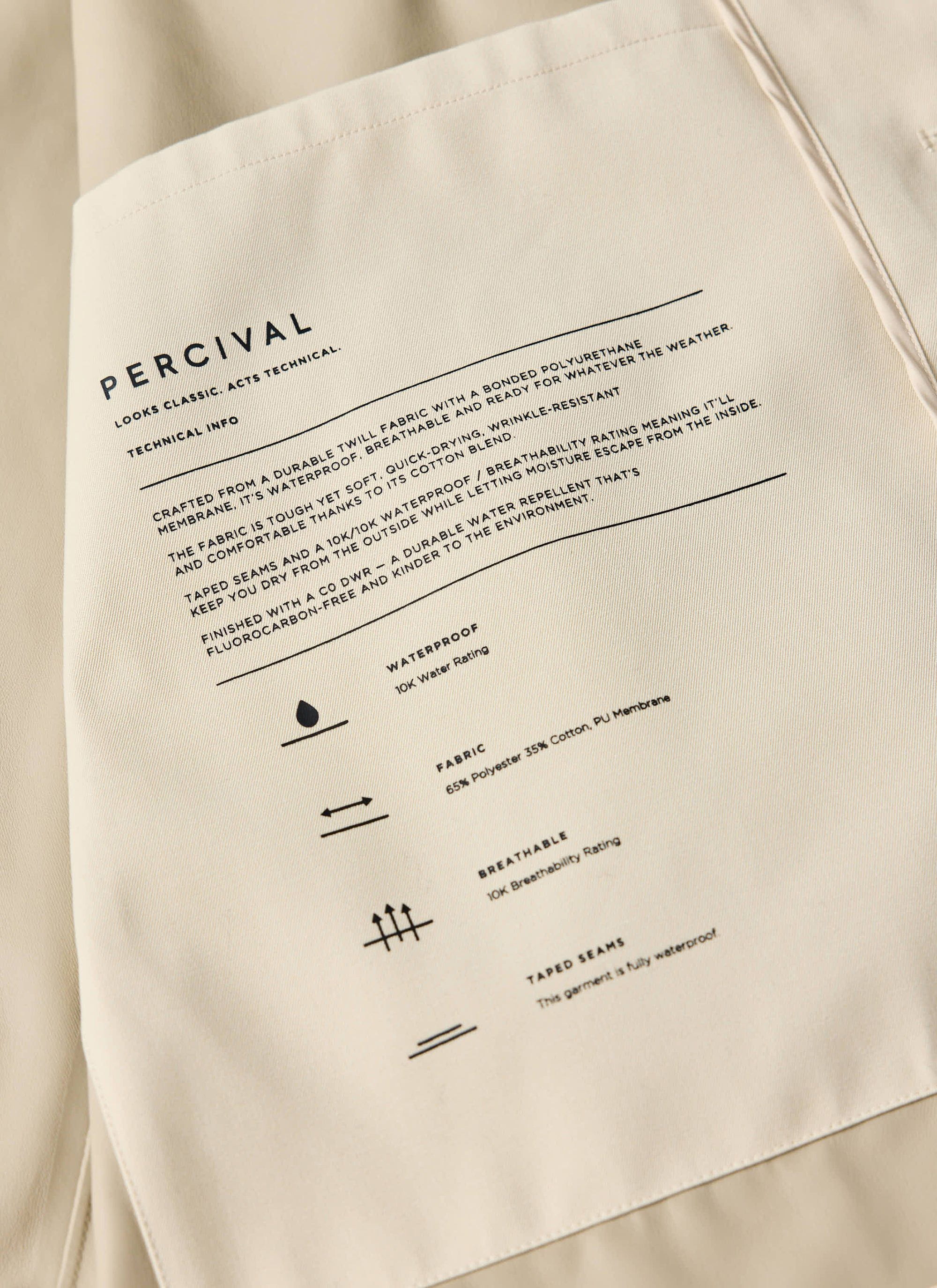 The Percival waterproof trench returns, upgraded with a 10,000mm waterproof rating and 2,000g breathability so you stay dry without breaking a sweat. Refined seams, a sharper cut, and fabric tested through countless rainy days. Rain proof, wind ready, and cut to carry you through every season. The trench that sets the standard.