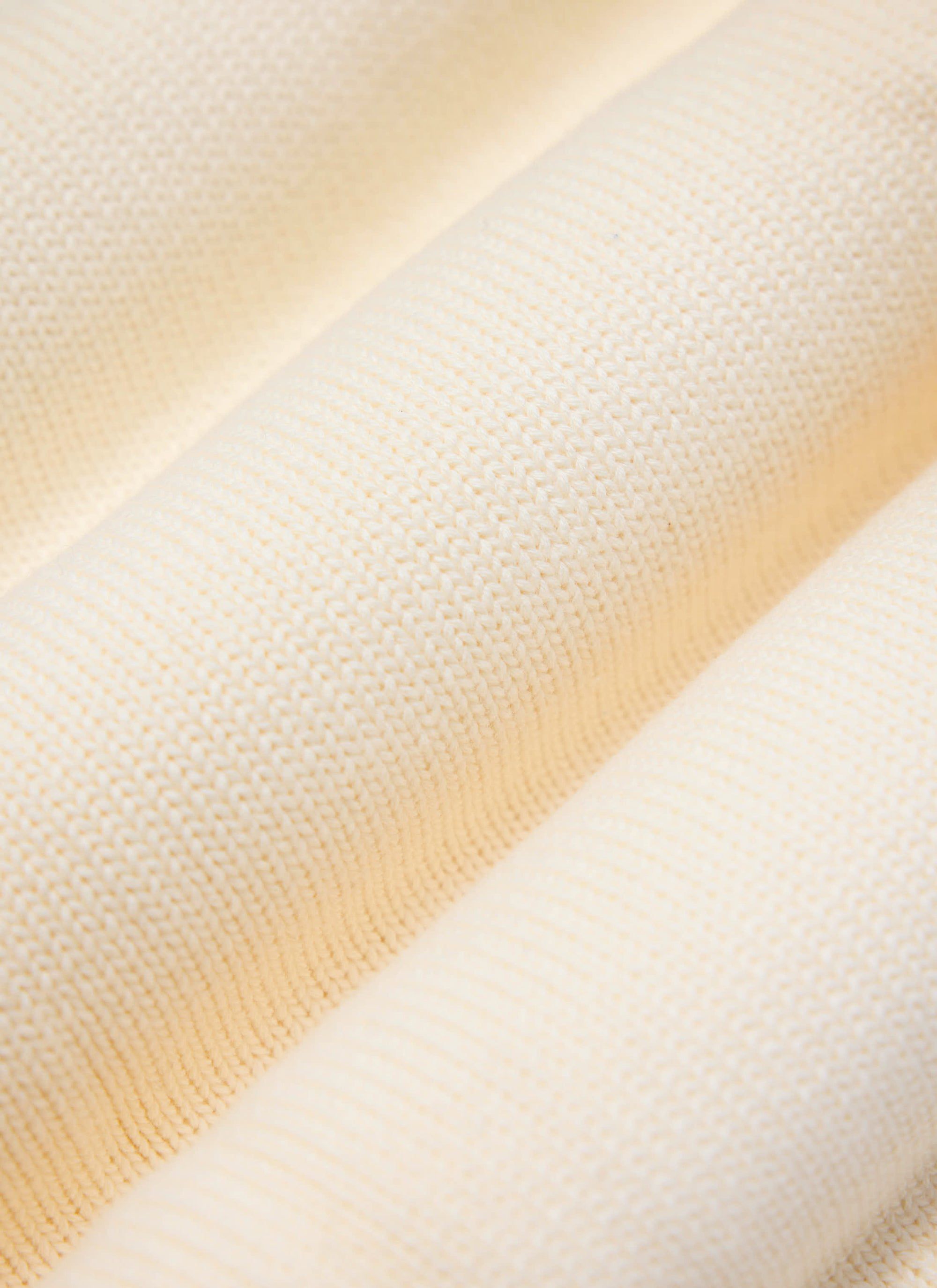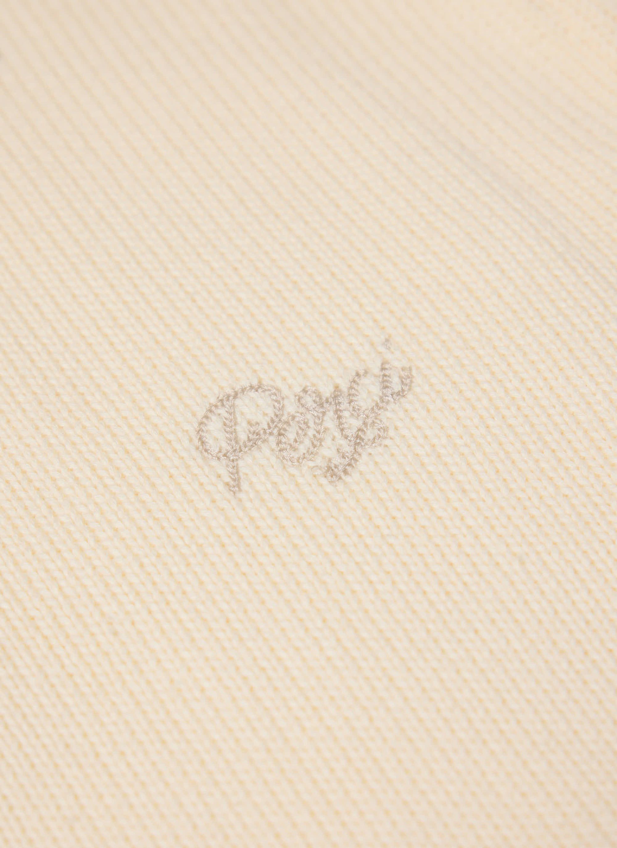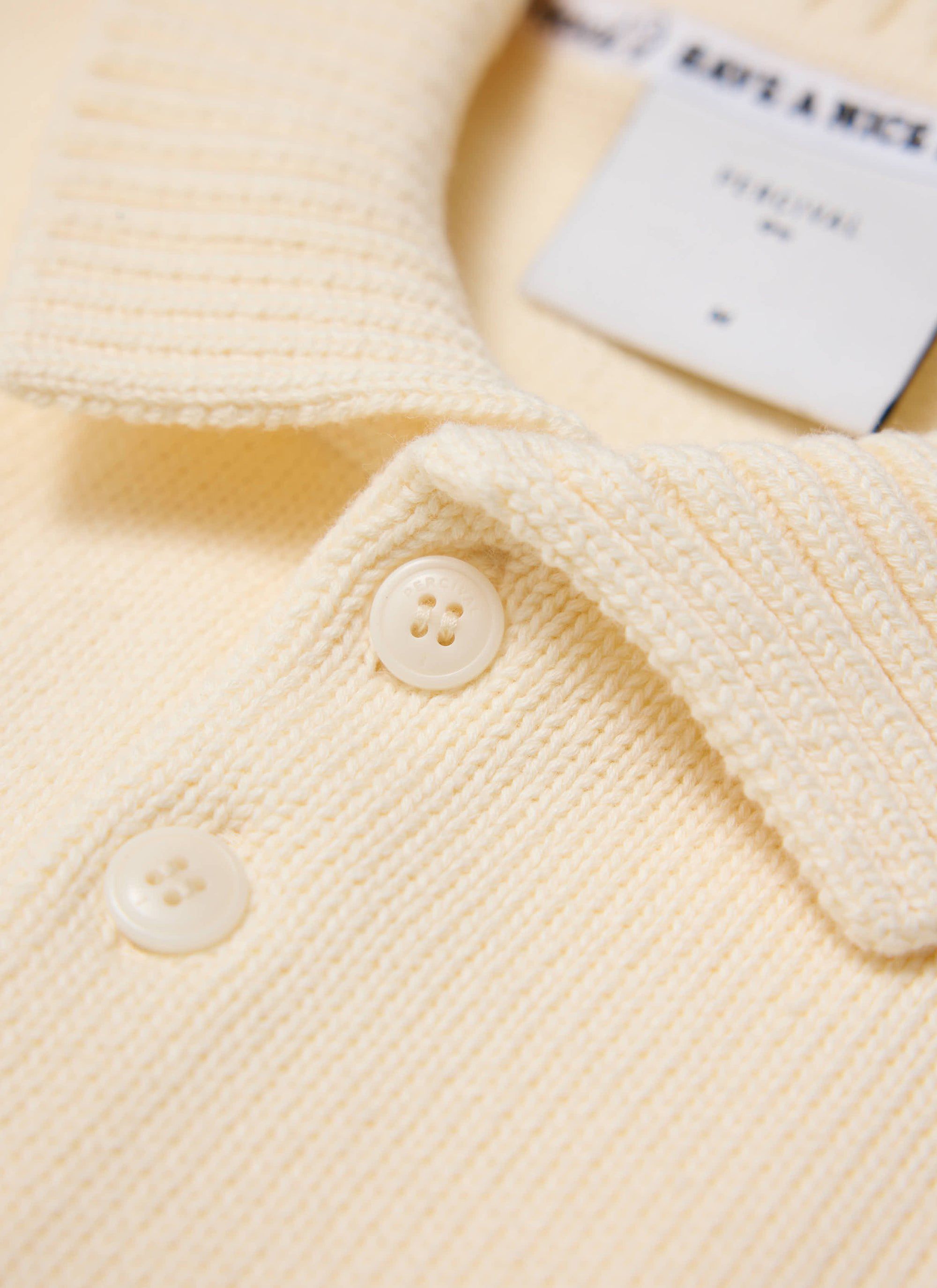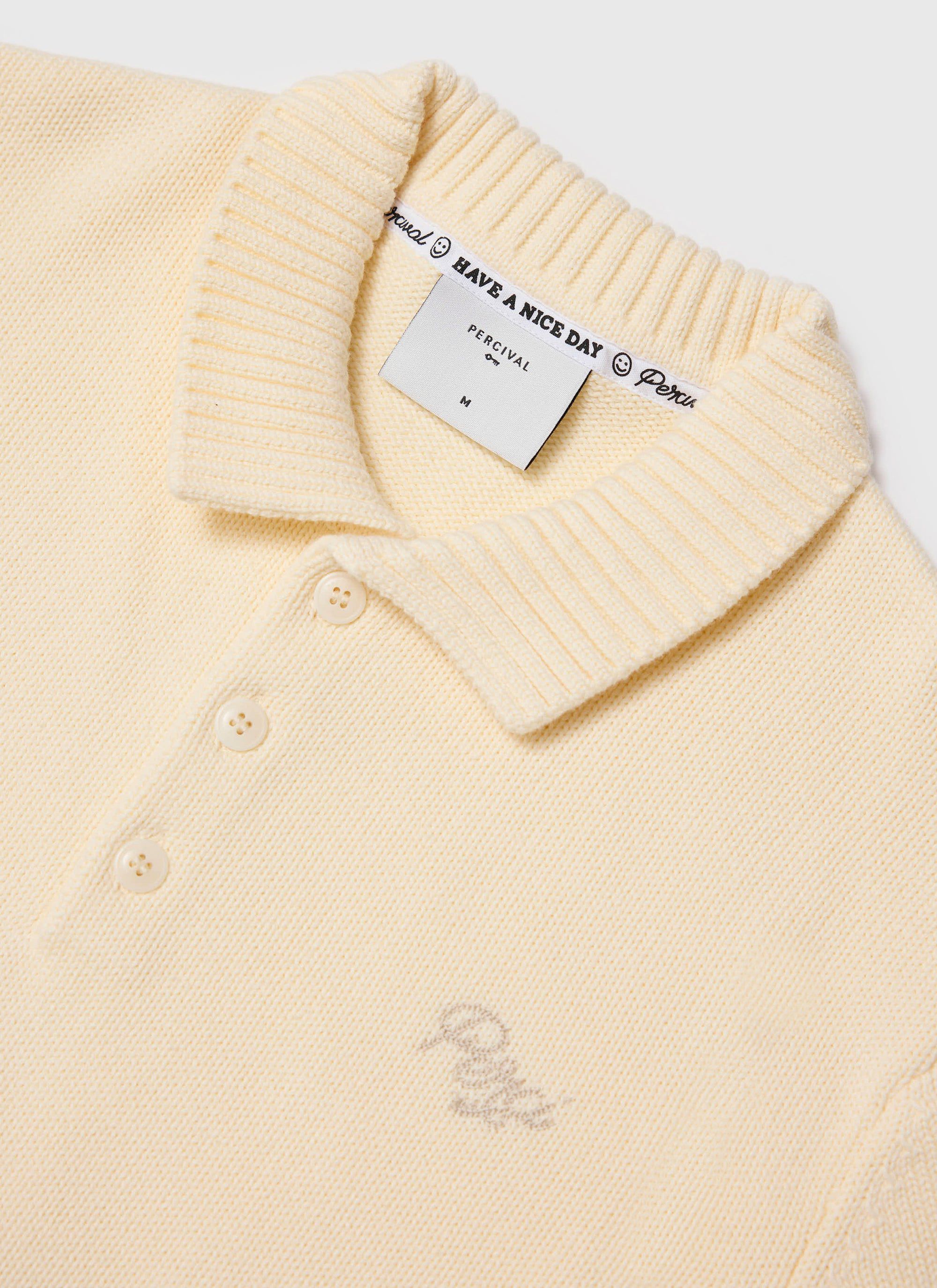 - Features: Men’s knitted short sleeve polo shirt in ecru cream made from 100% cotton. Designed with a quarter button placket, Percival patch, ribbed collar, ribbed sleeves, and ribbed hem. A cream knit polo shirt that combines comfort and structure, a versatile option for winter dressing and Christmas events.