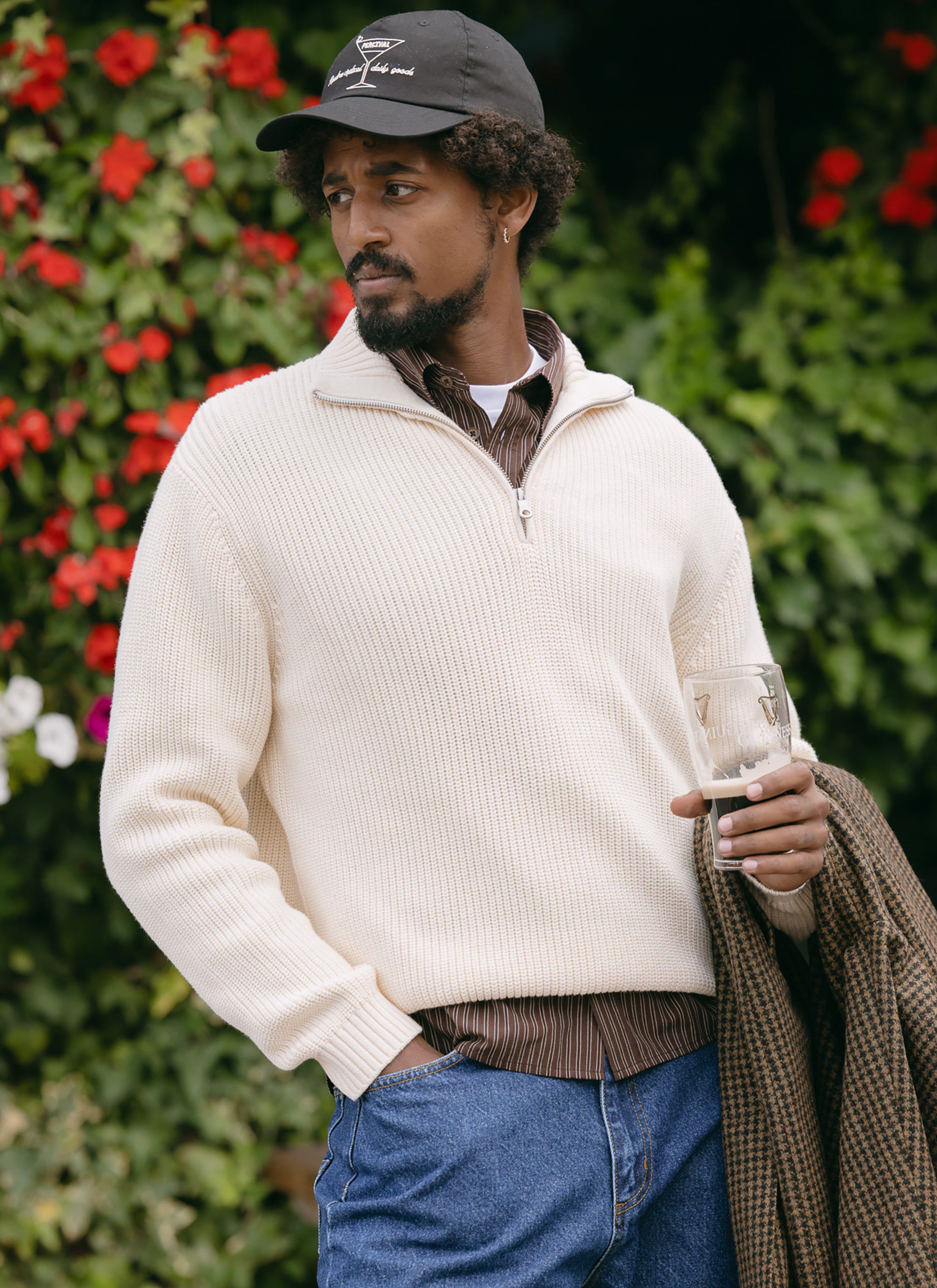 - Features: Men’s turtleneck fisherman in ecru made from 100% wool. Constructed with a chunky ribbed knit and finished with a zip turtle neck in a standard shape for a classic fit. A wool jumper that provides warmth in colder months and serves as a versatile layering piece.