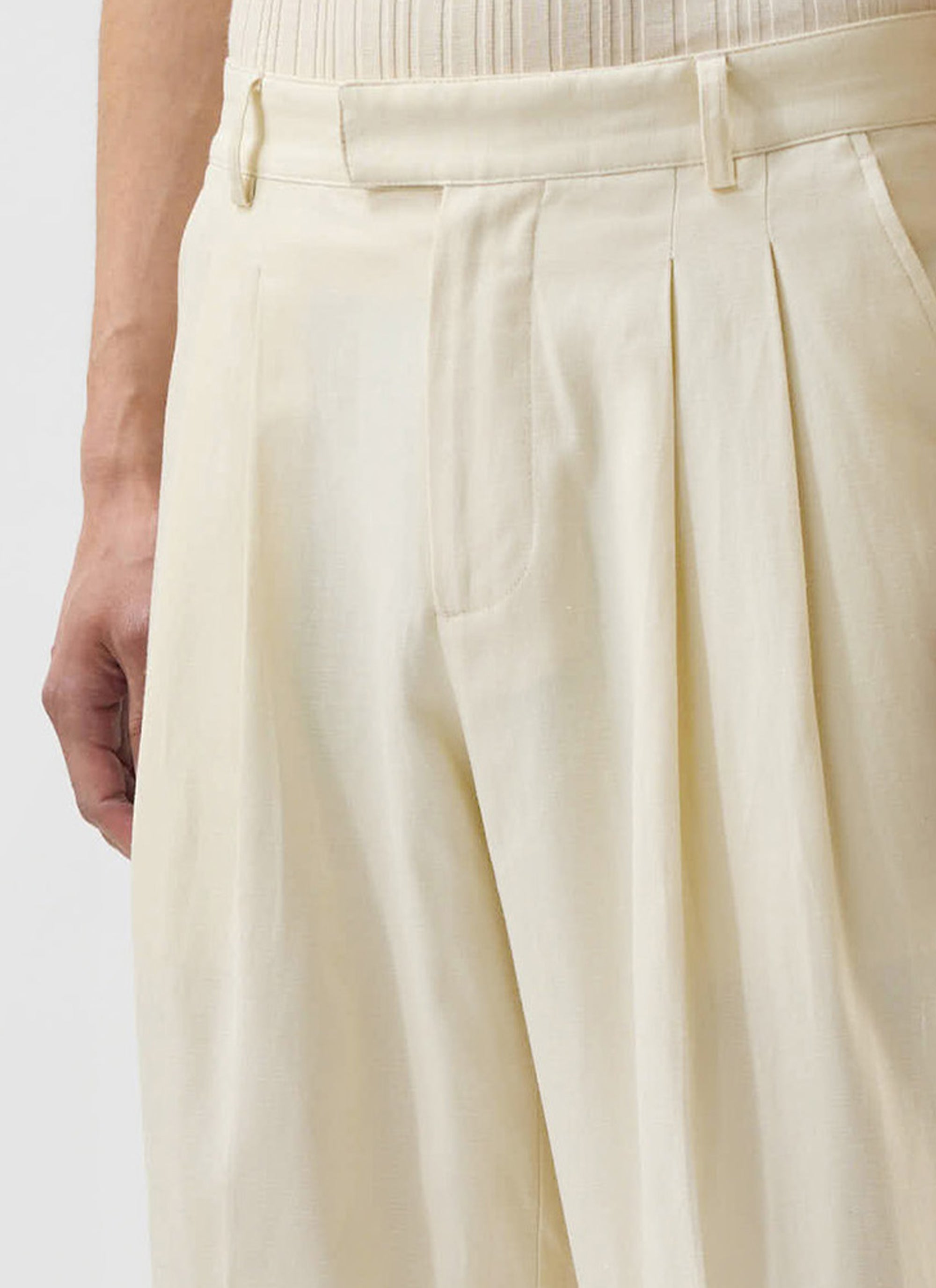 - Features: Men's Pleated Trousers in a Relaxed Fit, as part of the Warren Alfie Baker collection. Made from a premium lightweight fabric, these cream suit trousers offer breathable comfort with a soft yet durable feel. Designed with a true-to-size waist and double front pleats, they fall into a relaxed leg for effortless movement and modern shape. Style them with your go-to wardrobe staples or pair with the matching blazer for a refined suit look.