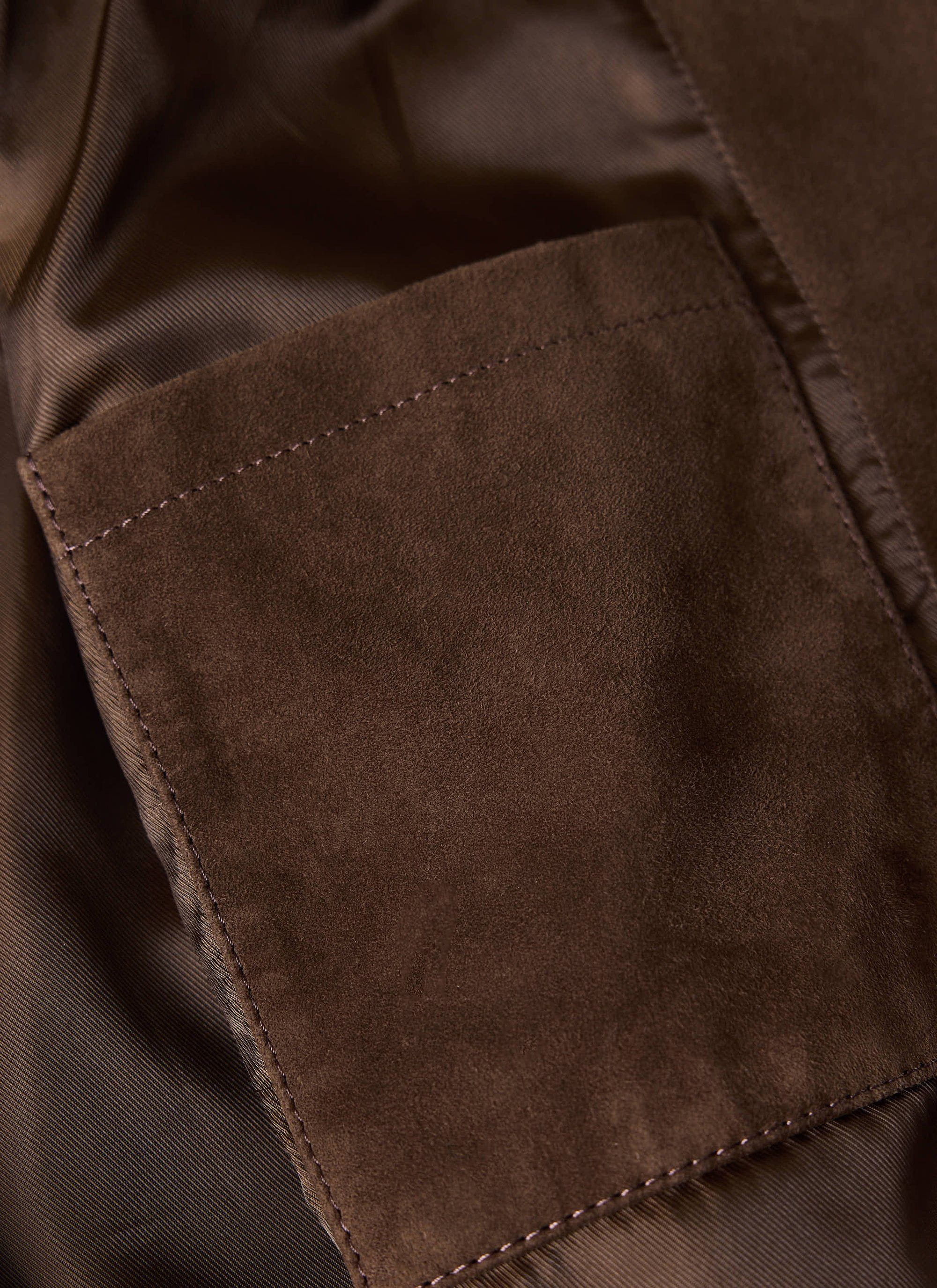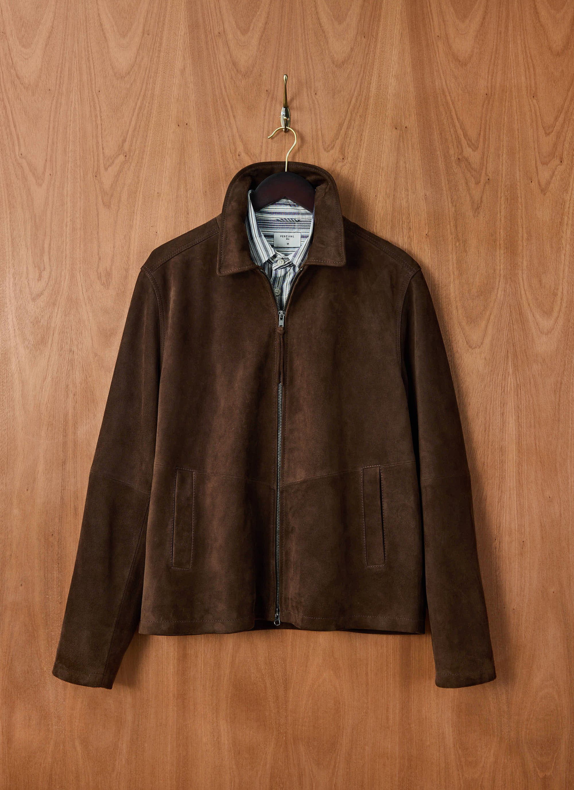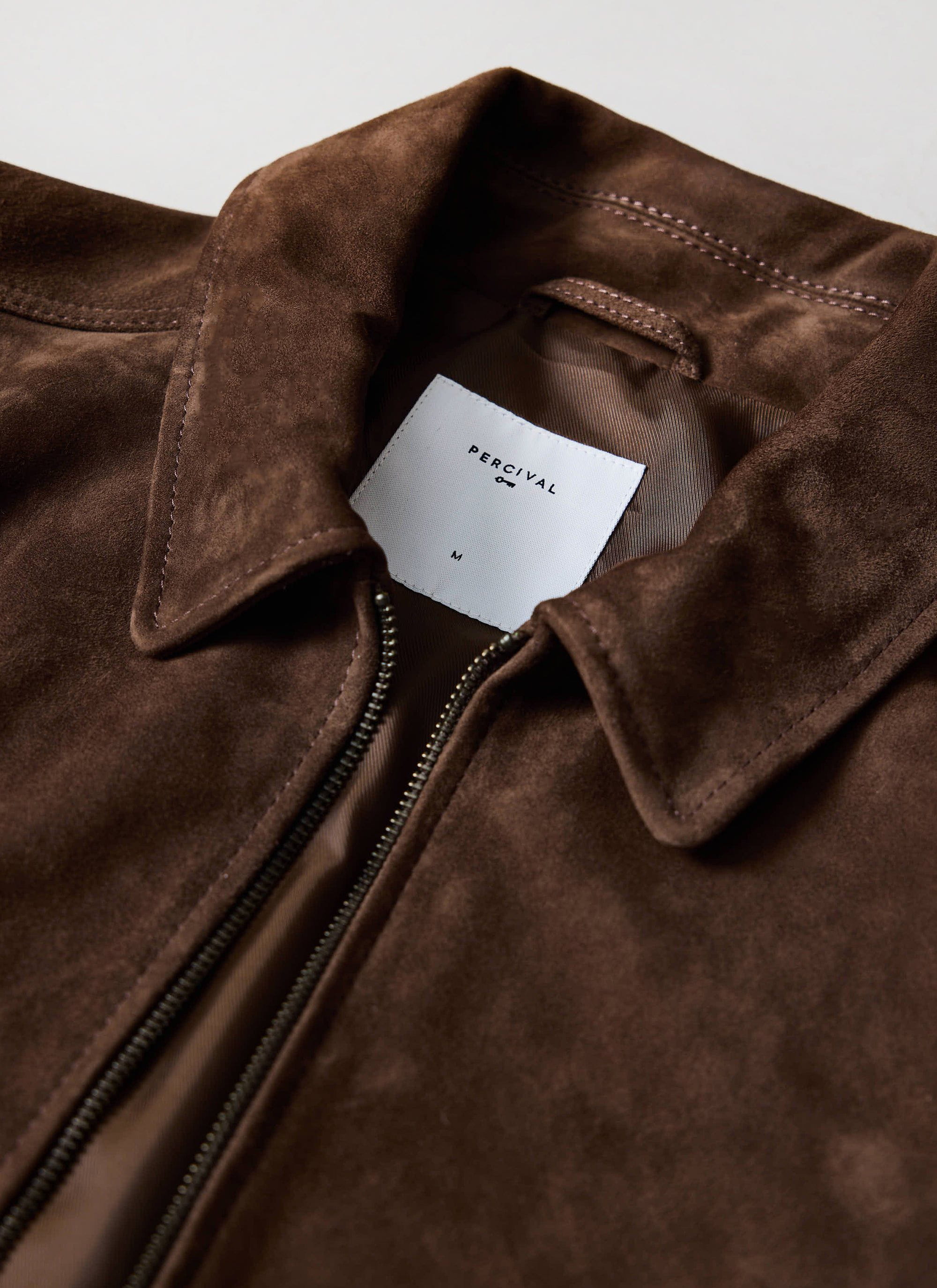 - Features: Men’s brown suede jacket made from 100% caprine leather suede for an ultra soft feel. Cut in a deep brown shade with a two way zip, internal patch pocket, and intricate stitching. This real leather jacket is a statement piece that can be styled with ease through autumn and winter.