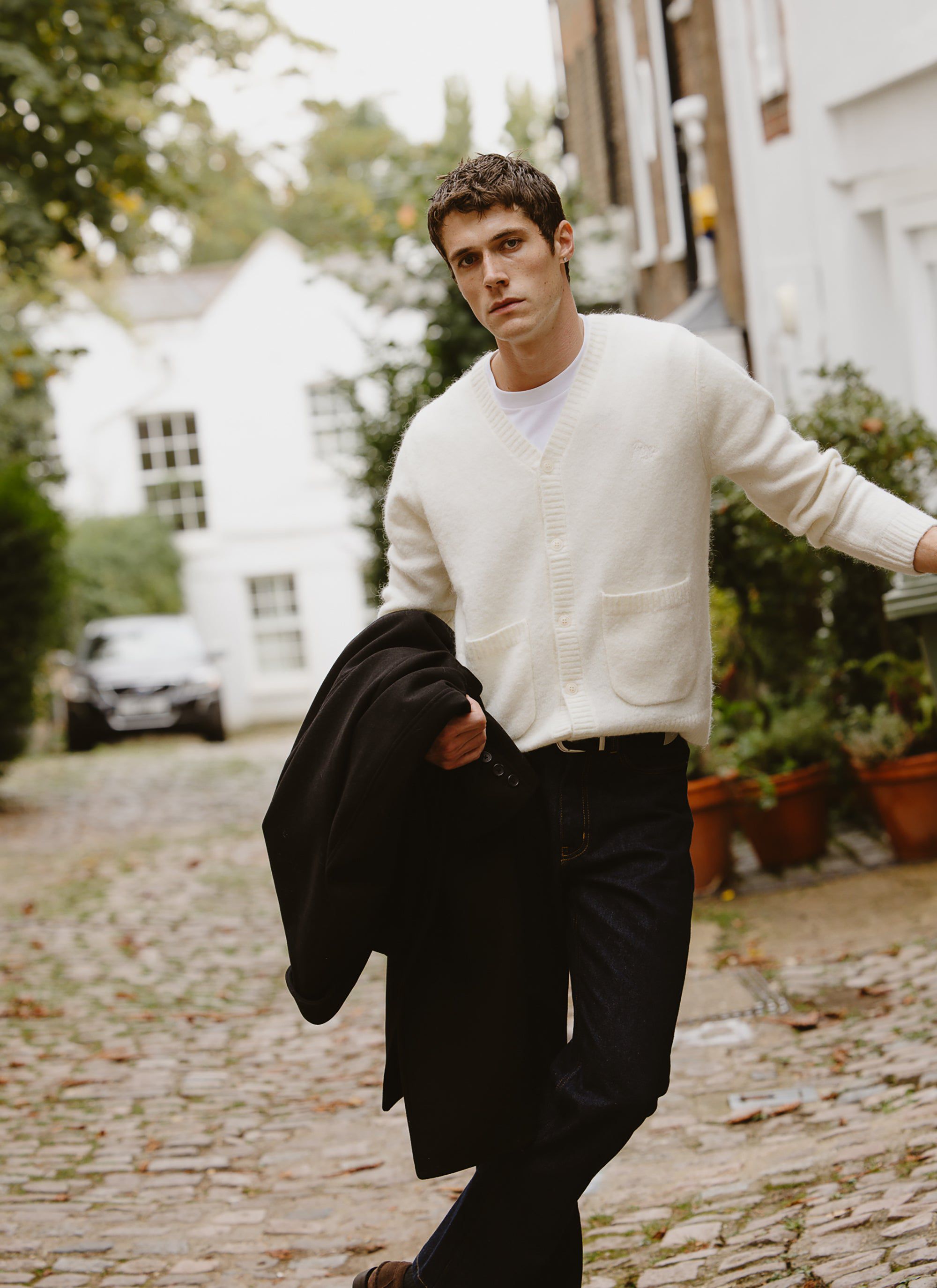 - Features: Men's cardigan made from a soft mohair wool blend. This mohair cardigan features a boxy fit with Perci tonal embroidery on the chest, functional pockets, and engraved branded button fastening. Perfect for layering.